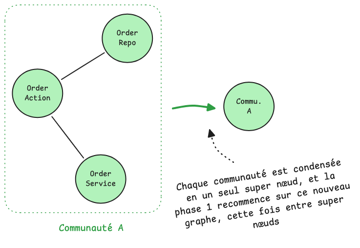 Une fois la phase 1 terminée, chaque communauté détectée est condensée en un seul nœud. Les arêtes entre deux communautés deviennent une arête entre les deux super-nœuds correspondants :