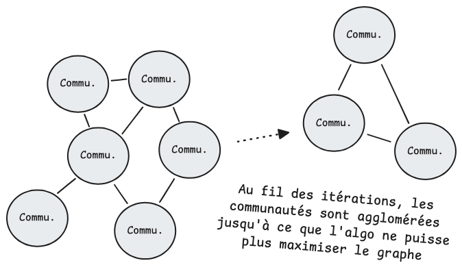 Ces deux phases alternent jusqu'à ce que plus aucune amélioration ne soit possible, ni au niveau des nœuds individuels, ni au niveau des super-nœuds, l'algorithme s'arrête alors et retourne le découpage final.