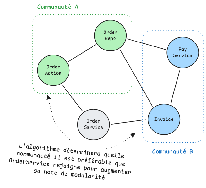 Si l'algorithme place OrderRepository dans la communauté Notification plutôt que dans celle d'Order, c'est qu'elle interagit davantage avec les classes de ce module qu'avec celles du sien.