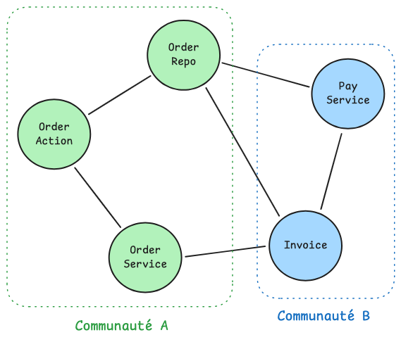 Dans un graphe de dépendances, une communauté désigne un groupe de nœuds qui interagissent davantage entre eux qu’avec le reste du graphe.