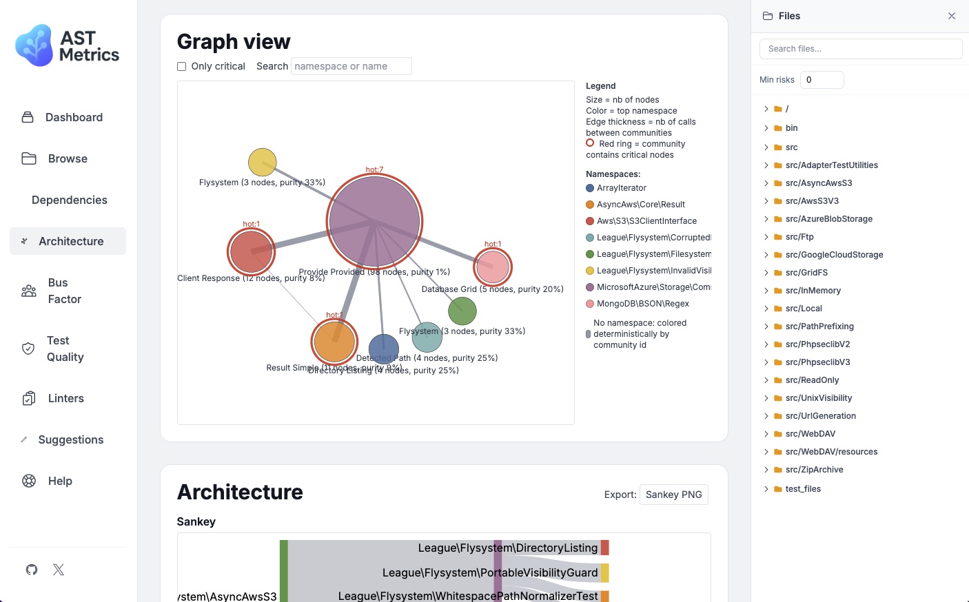 Pour aller plus loin, ast-metrics propose quant à lui une analyse bien plus complète de l'architecture : métriques de couplage, statistiques sur les dépendances, visualisations avancées.
